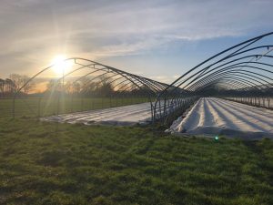 Ein treuer Helfer dabei ist seit vielen Jahren auch der alte “MF 148” Schlepper, Baujahr 1972. Damit ist er fast so alt wie der Erdbeeranbau bei uns, der bis in die sechziger Jahre zurückreicht. Der alte Schlepper sorgt für den raren, erdbeerroten Farbtupfer auf dem grün-weiß-braunem Feld. Der kleine Schlepper ist der Leichteste im Fuhrpark. Er produziert den geringsten Bodendruck und ist damit am Besten geeignet für das Auslegen der großen Vliesrollen. Ohne Schlepperkabine ist das für den Fahrer bisweilen ein ziemlich “schattiges Vergnügen”, so dass auch für den Fahrer gilt: warm einpacken!